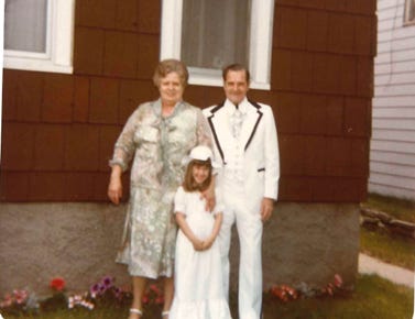 My Grandpa and Grandma Allard and me, all set for my aunt’s wedding. Grandma would later be my school’s hot lunch lady.