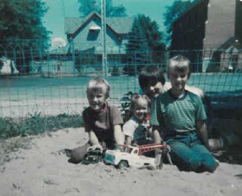 Our backyard sandbox, with Sacred Heart Church in the background.