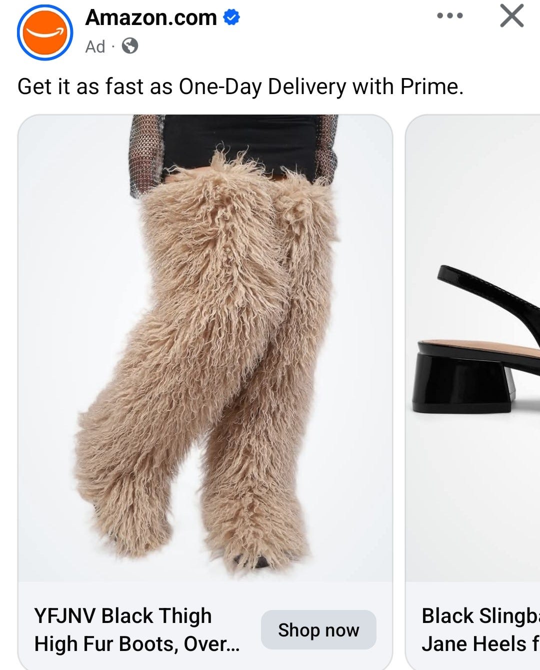 Example 2: While Amazon showed me the cute slippers above, they also showed me these black thigh high fur boots. I am genuinely concerned about how many Muppets were sacrificed to make these.