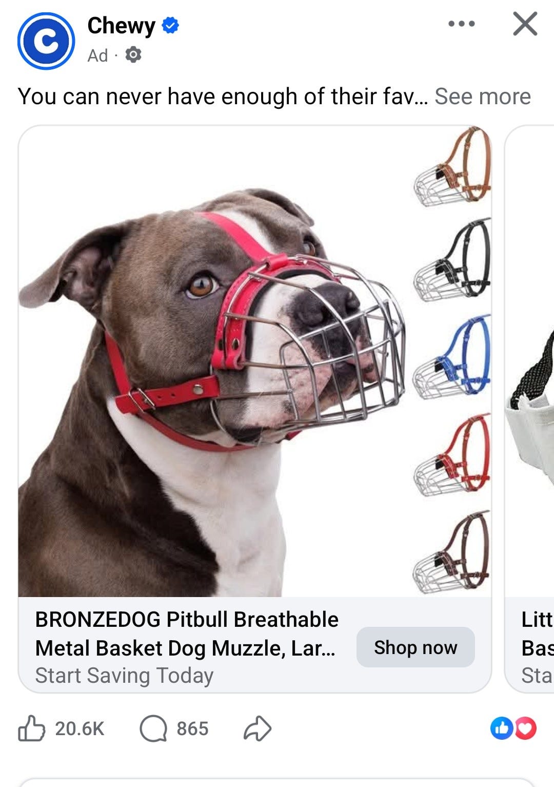Example 3: Chewy. Let’s start with the fact that I don’t own any pets, so Chewy should not even be in my feed. But secondly … a pitbull muzzle is the first thing presented to me? A Chewy Vuitton toy makes sense. This seems aggressive. I mean, at least buy me dinner first, Chewy.