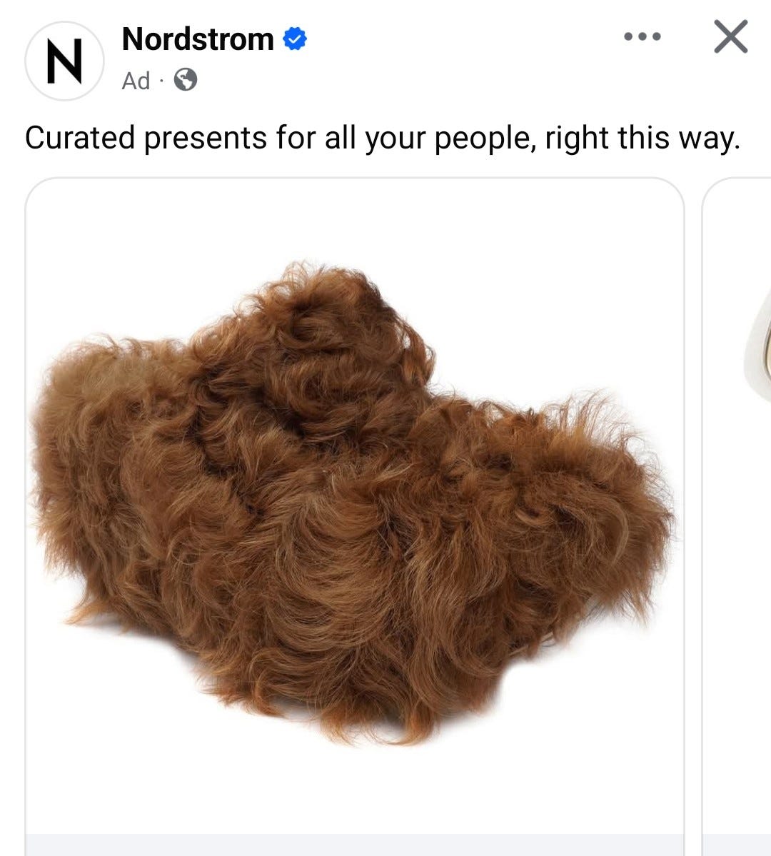 So Nordstrom decides to lead off their “curated” Valentines gift selections with this. Any guesses? Old Annie wig that wasn’t quite curly enough for the job? A curled-up dog? Baby-sized Ewok costume? Nope. These are actually slippers, folks. Now I don’t know about you, but these don’t exactly scream “romantic” as much as they announce to the world you want to wear old lady wigs on your feet.
